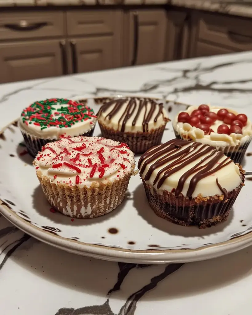 You can arrange them on a festive platter, display them in mini cupcake boxes, or serve with a dessert fork for a fancy touch. They travel well and stay pretty even outside the fridge for 30 minutes or so.