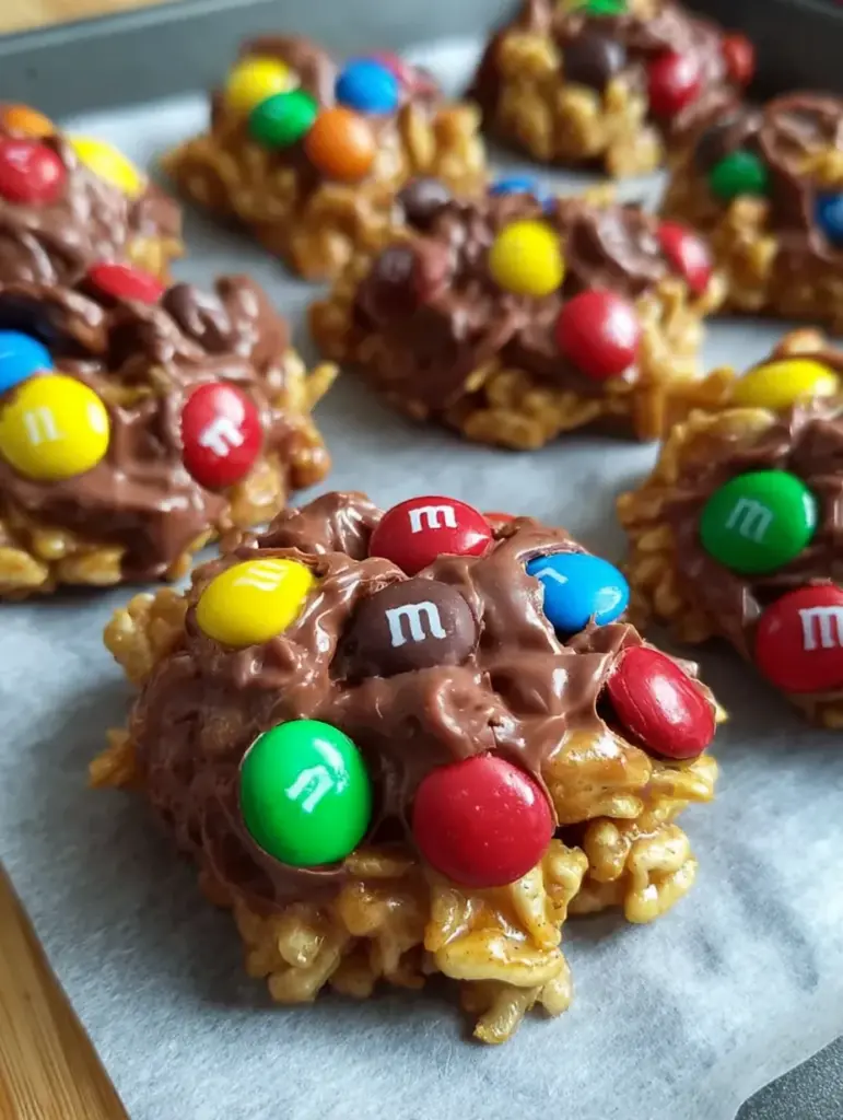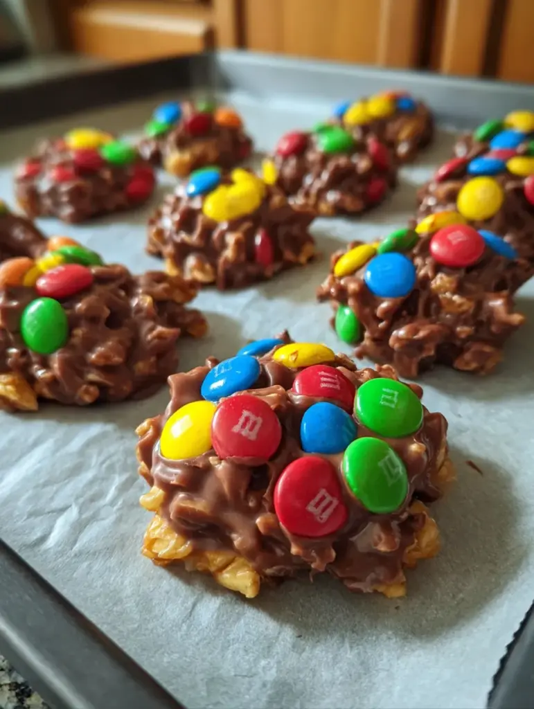 While the chocolate is still soft, press a handful of M&M’s into the top of each cluster. Don’t be shy—you want that pop of color and crunch in every bite.