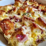 A delicious and savory Monte Cristo Breakfast Casserole, combining eggs, ham, Swiss cheese, and French bread, perfect for brunch or breakfast gatherings.