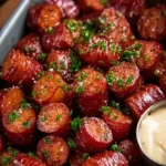 Once they’re perfectly cooked, remove the kielbasa bites from the air fryer or oven. Brush or pour the remaining mustard sauce over the top of each one. For a beautiful touch, garnish with freshly chopped parsley. Serve warm alongside your creamy dipping sauce. Prepare for smiles and satisfied appetite!