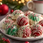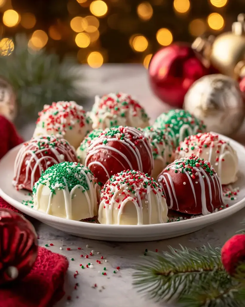 Now for the best part—decorating! Melt your red and green candy melts in separate bowls, following the package instructions. Once melted, it’s time to coat the cheesecake balls. Dip each one into the colorful chocolate, giving it a nice, even coat. Let the excess drip off, then quickly sprinkle them with your fun holiday sprinkles! This is what makes these bites a festive hit, offering a pop of color and joy.