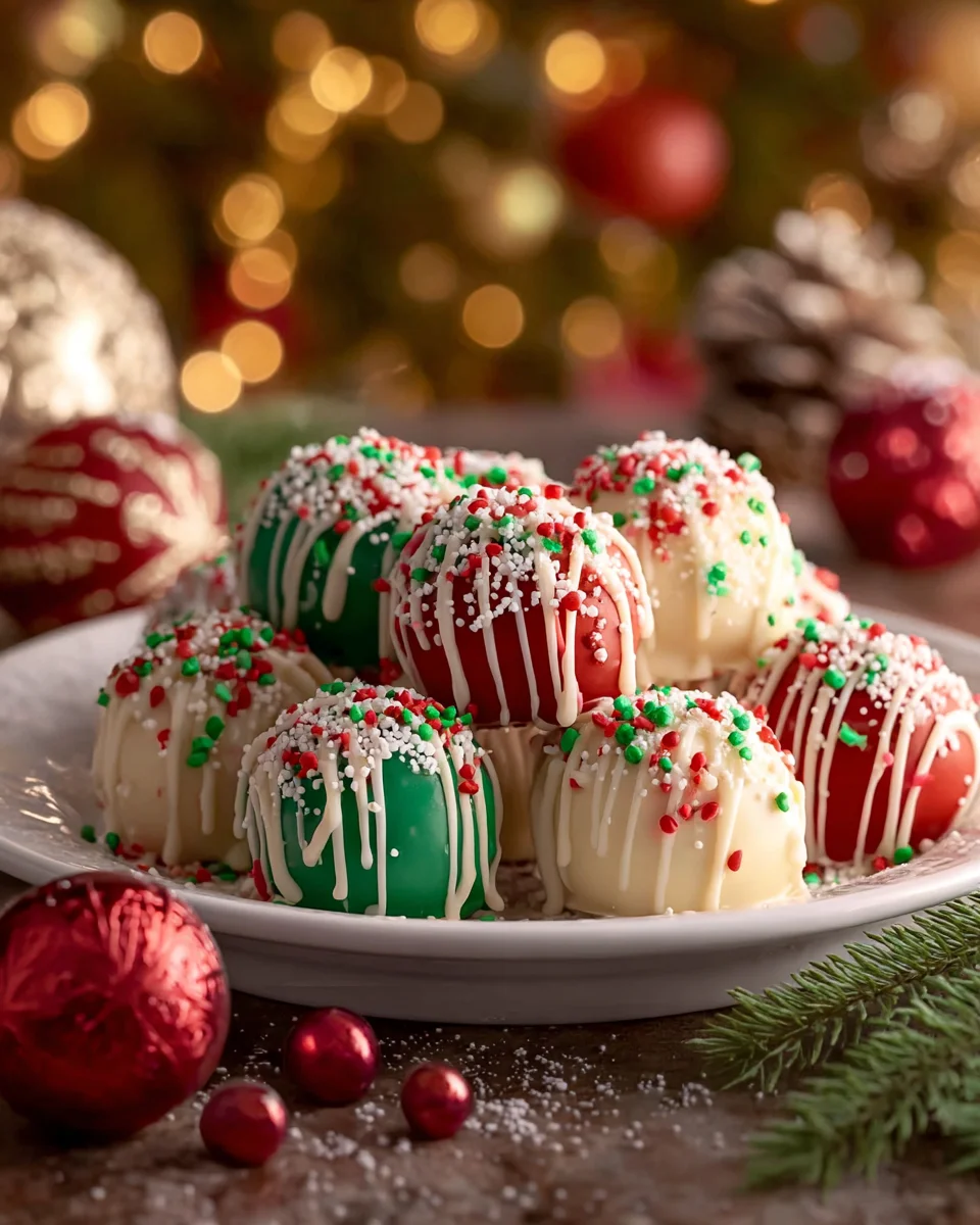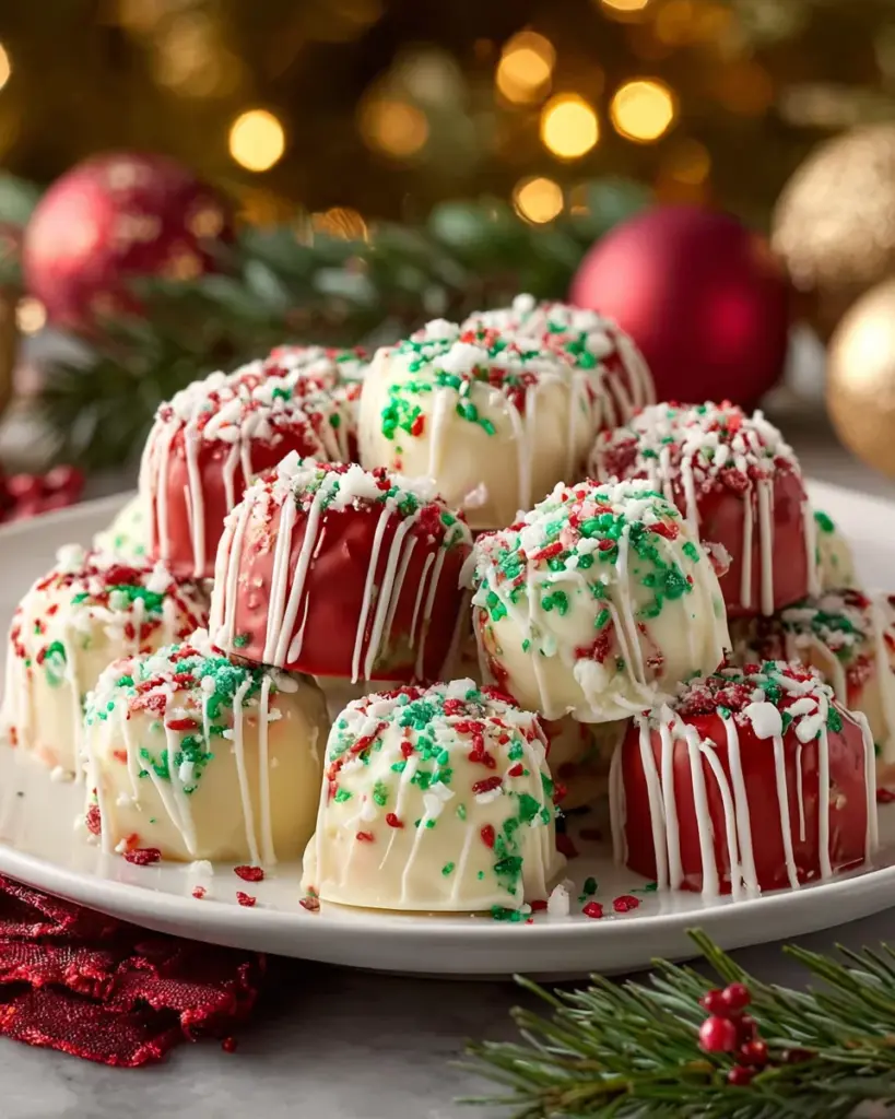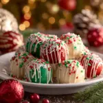 Delicious no-bake cheesecake bites perfect for holiday celebrations, coated in festive colors and topped with sprinkles.
