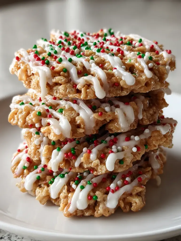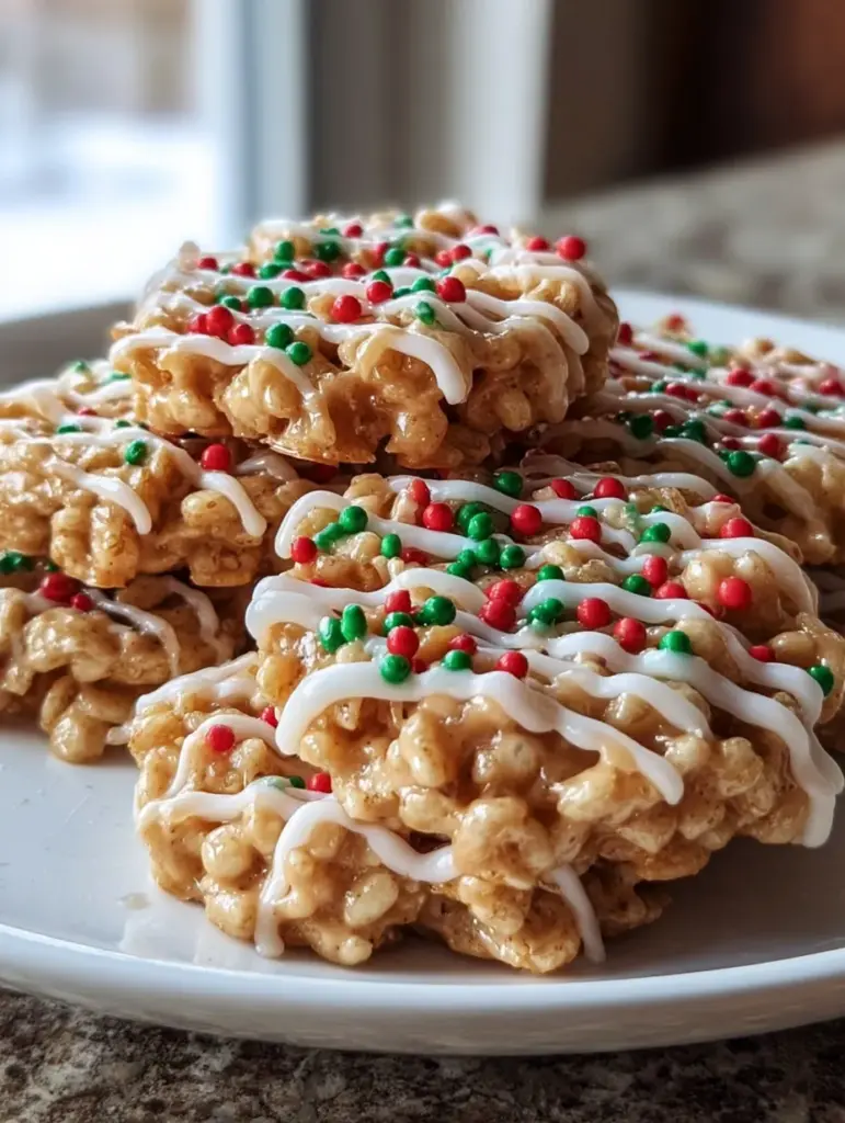 🎄 Sweet, chewy, and perfectly festive! ✨ These no-bake Christmas Crunch Cookies are loaded with caramel-peanut butter flavor, crispy rice crunch, and finished with a glossy vanilla drizzle and holiday sprinkles. Easy, nostalgic, and impossible to resist! 🍪😍