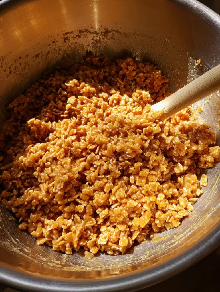 Pour the hot mixture over the crispy rice cereal in a large bowl and stir until evenly coated and glossy. ⏱️ 5 minutes