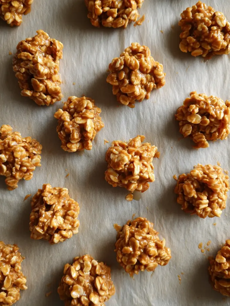 Using a spoon (or cookie scoop), drop generous spoonfuls onto the parchment-lined tray. Press gently into rough clusters with your fingers or the back of the spoon. You’re aiming for that “imperfectly perfect” homemade cookie look — just like in the photo!