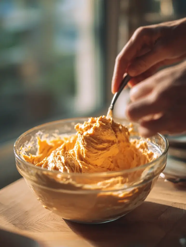 🎃 Blend the Base (3 minutes): In a mixing bowl, beat together cream cheese, pumpkin purée, powdered sugar, vanilla extract, pumpkin pie spice, and cinnamon until creamy and smooth.