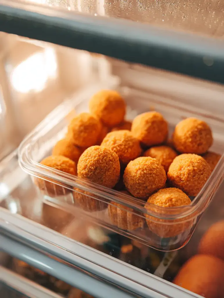 After rolling and coating the balls, store them in an airtight container in the fridge. They’ll stay fresh for up to 5 days. Keep them separated with parchment paper layers to prevent sticking.