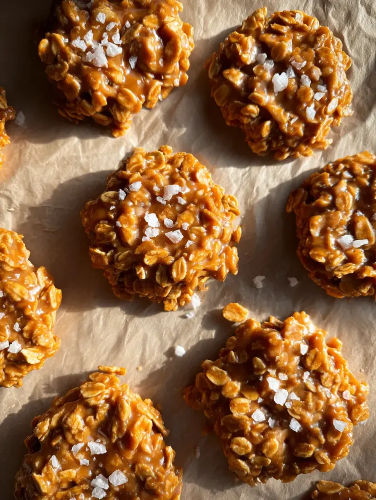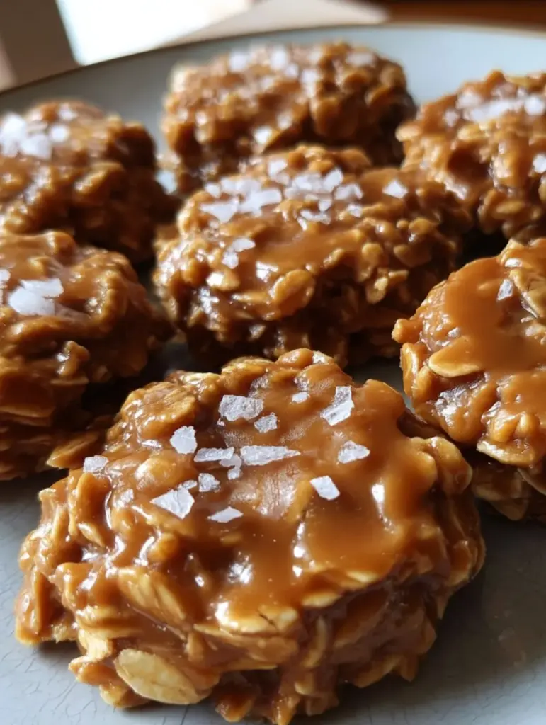 The cookies shown in the image perfectly represent what this recipe is all about: thick, chewy rounds, visibly packed with oats, coated in a glossy caramel-peanut butter mixture, and finished with a delicate sprinkle of flaky sea salt. They look rustic, homemade, and irresistibly inviting—exactly how no-bake cookies should look.