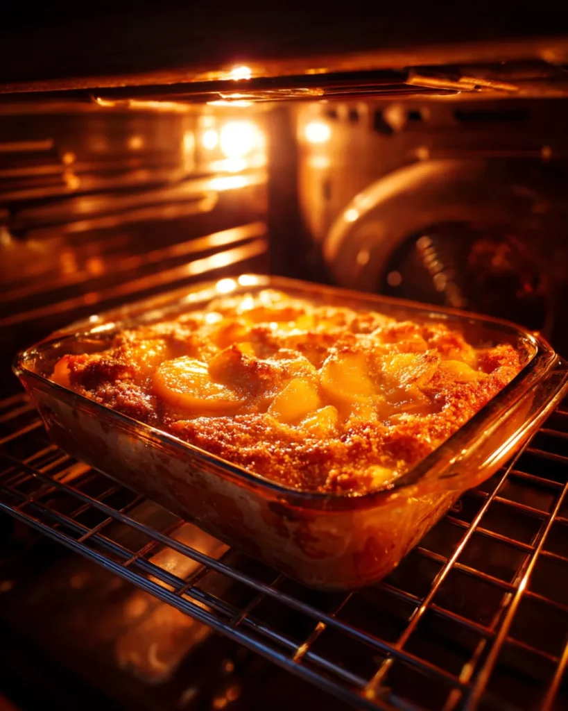 Pop the dish into a 350°F (175°C) oven and bake for about 40–45 minutes. The top should turn golden brown, and the cobbler should puff up slightly as it cooks. The smell filling your kitchen will be pure heaven—warm butter, cinnamon, and sweet peaches. To check for doneness, insert a toothpick into the center. If it comes out clean, your cobbler is ready.