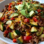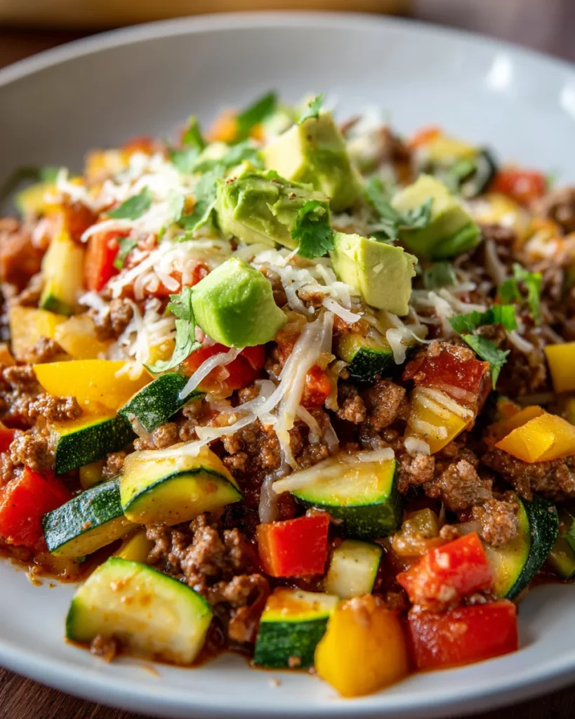 A flavorful and easy one-pan dish that combines ground beef, zucchini, and bell peppers seasoned with taco spices, topped with melted cheese.
