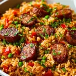 The smell of sausage searing in a hot pot always feels like a warm welcome. In this one-pot sausage rice, those browned, caramelized edges of sausage meet tender, fluffy grains of rice that soak up a rich tomato-and-broth bath — every spoonful sings with savory depth and a touch of sweetness from the bell pepper. Steam rises fragrant with garlic and paprika, and when you fold in bright green peas at the end, the dish pops with color and a hint of sweetness that balances the savory backbone.