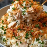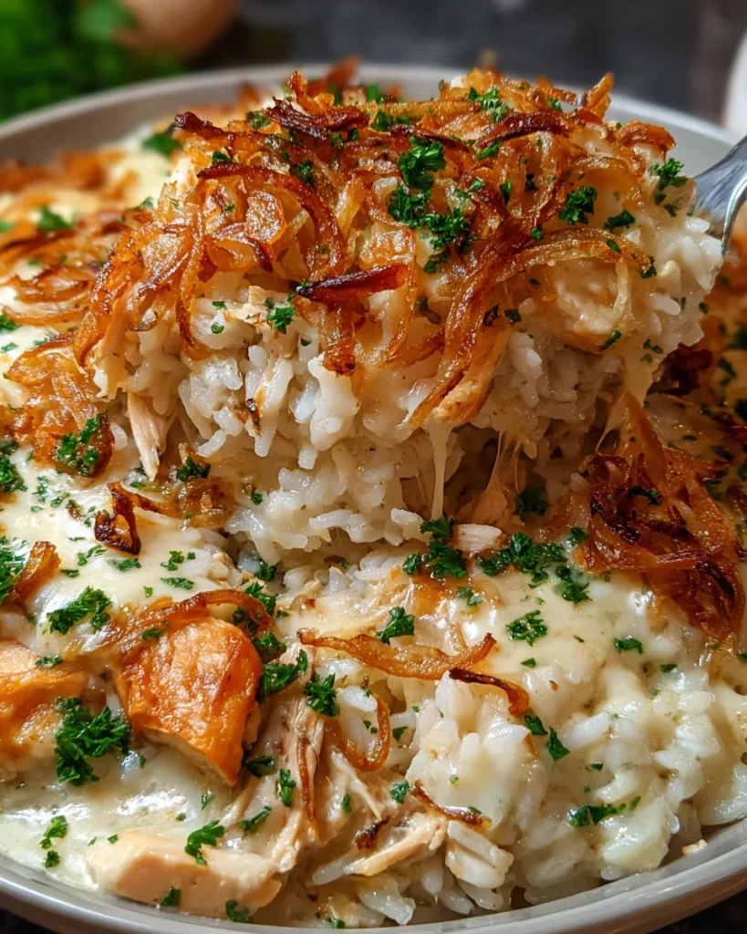A creamy and delicious casserole featuring shredded chicken, rice, and a blend of savory soups topped with crispy fried onions.