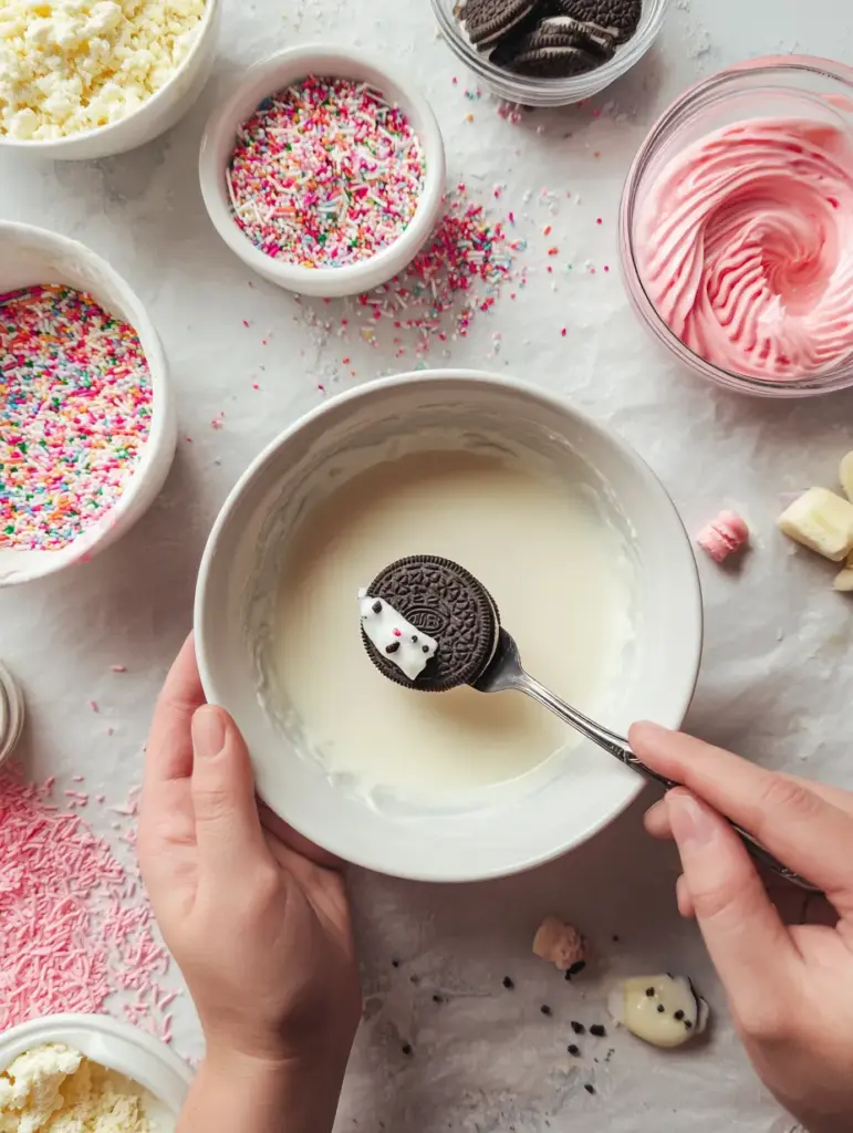 Using a fork or dipping tool, lower each Oreo into the melted chocolate (either white or pink). Submerge fully, then lift and let the excess drip off.