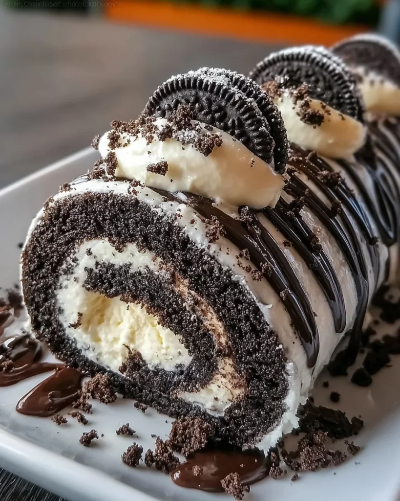 A decadent dessert roll filled with a rich cream cheese filling and Oreo cookie crumbs, topped with melted white chocolate and extra Oreos.