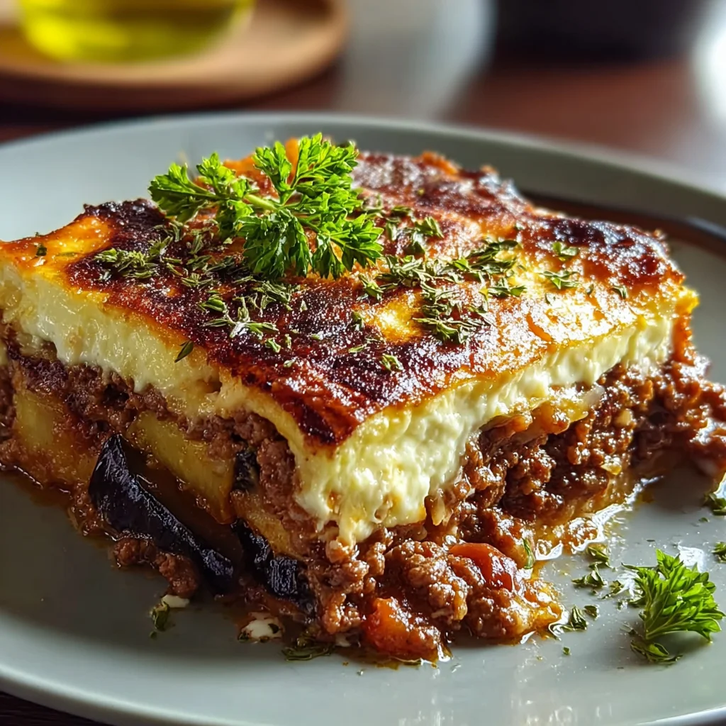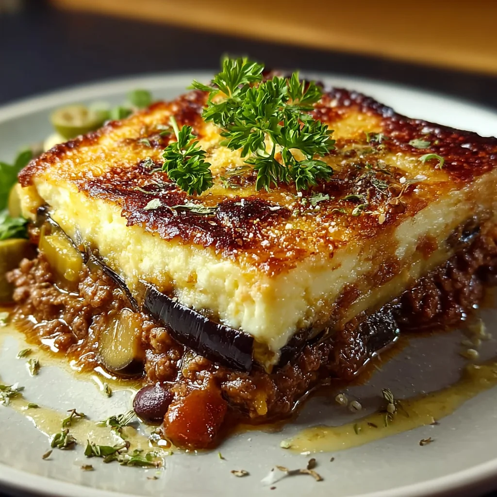 A rich and indulgent Greek dish featuring layers of sautéed vegetables and a hearty meat sauce, all topped with a creamy bechamel.