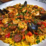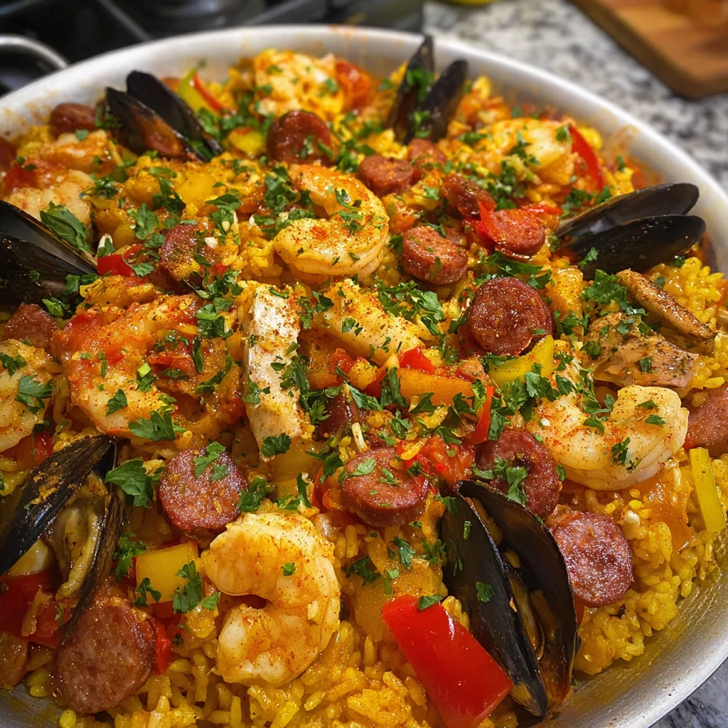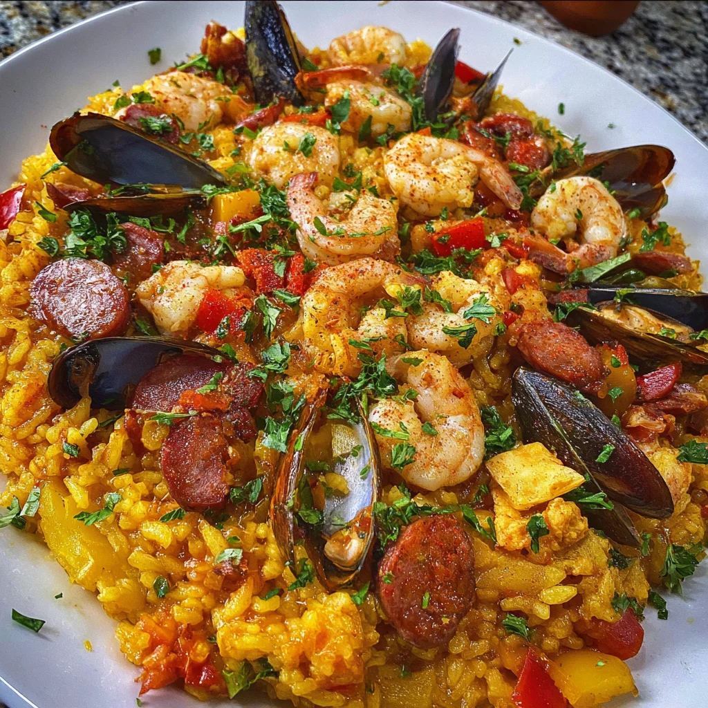 A delicious and traditional Spanish dish made with rice, saffron, chicken, seafood, and flavorful spices.