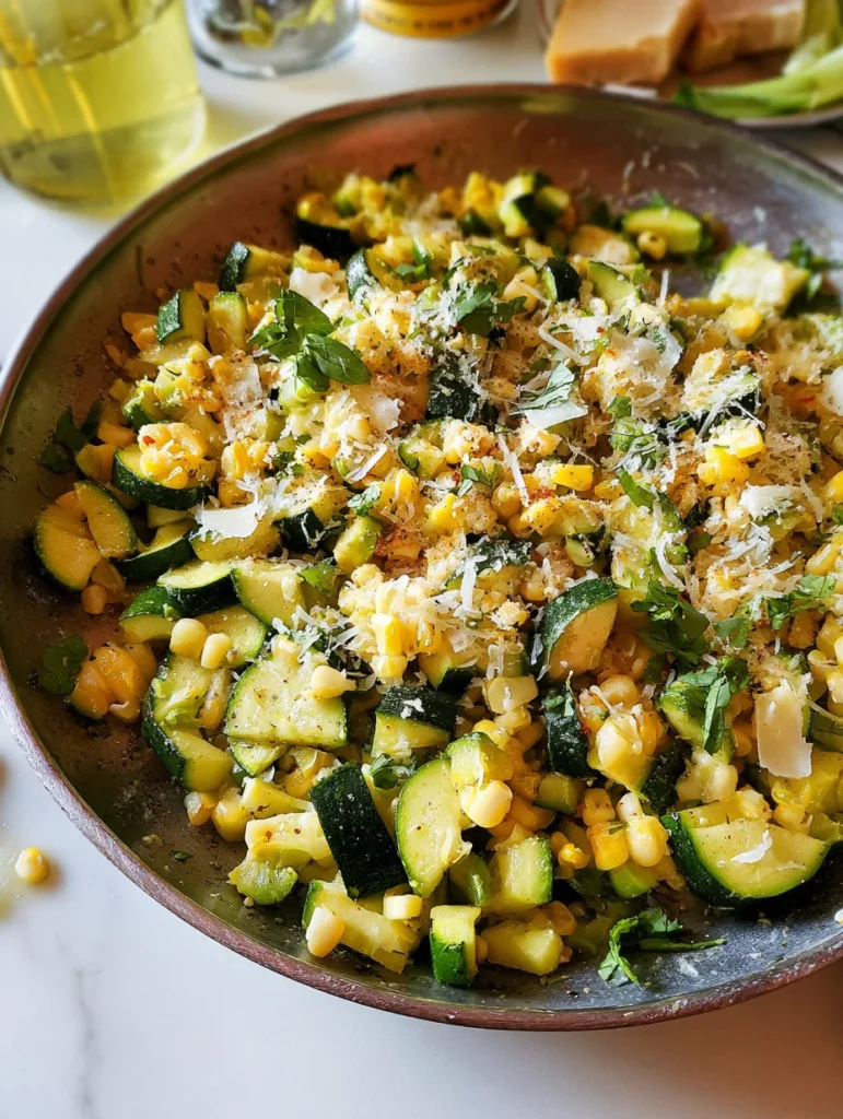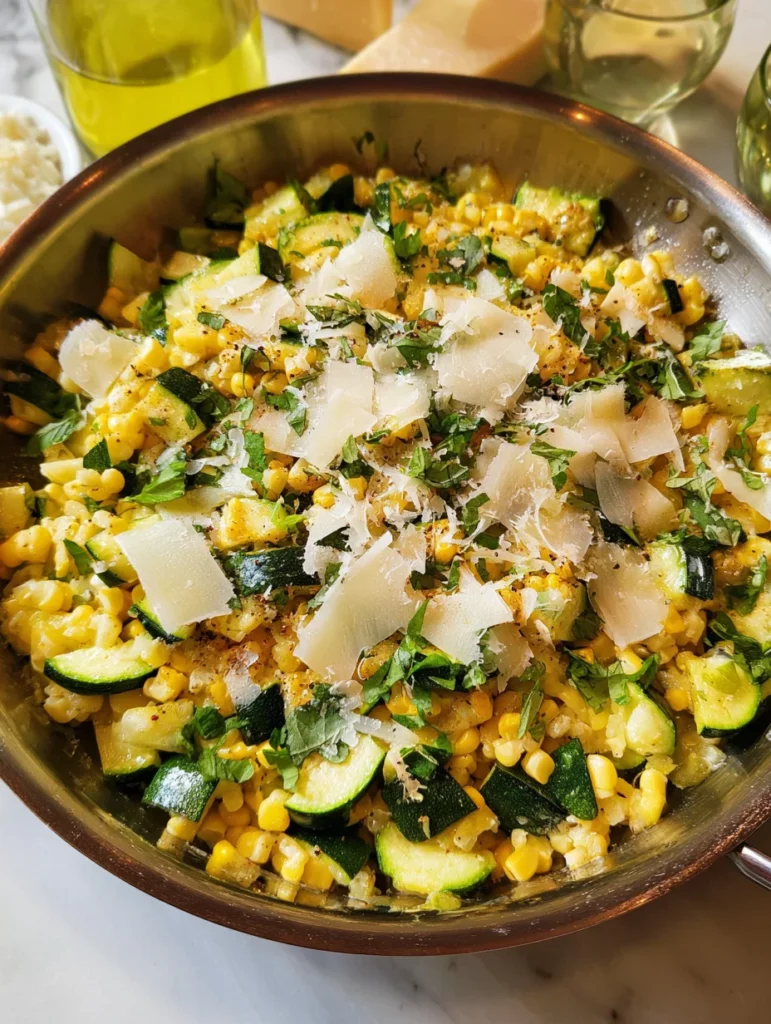 A delightful summer dish featuring tender zucchini and sweet corn, topped with shaved Parmesan cheese.