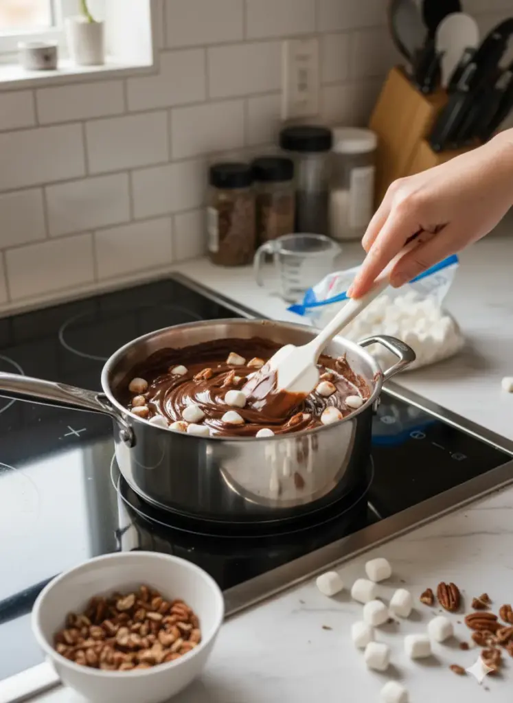 Remove from heat and immediately stir in the mini marshmallows, chocolate chips, and vanilla extract until completely melted and smooth (2 minutes). 🍫🤍