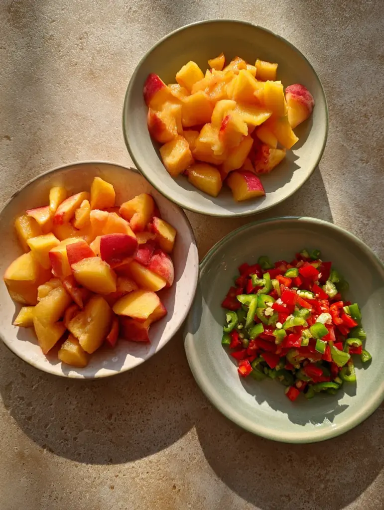 Prepare the fruit: Peel and finely chop the peaches. Dice the jalapeños and red bell pepper very small for a smooth, glossy jam texture 🍑🔪