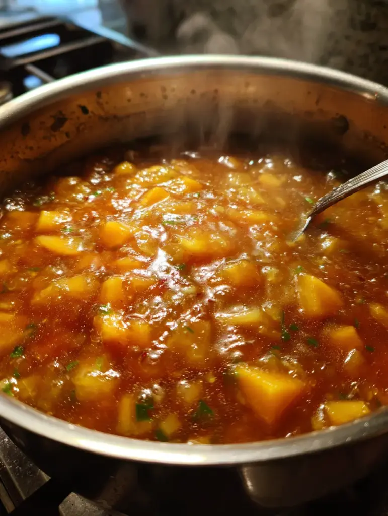 ⏱️ 10 minutesCombine base ingredients: In a large heavy-bottom pot, combine peaches, jalapeños, red bell pepper, apple cider vinegar, lemon juice, and pectin. Stir thoroughly until well mixed 🍋🥄
