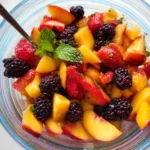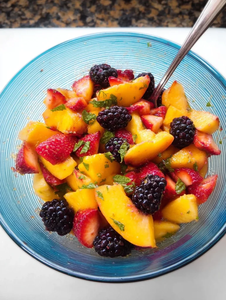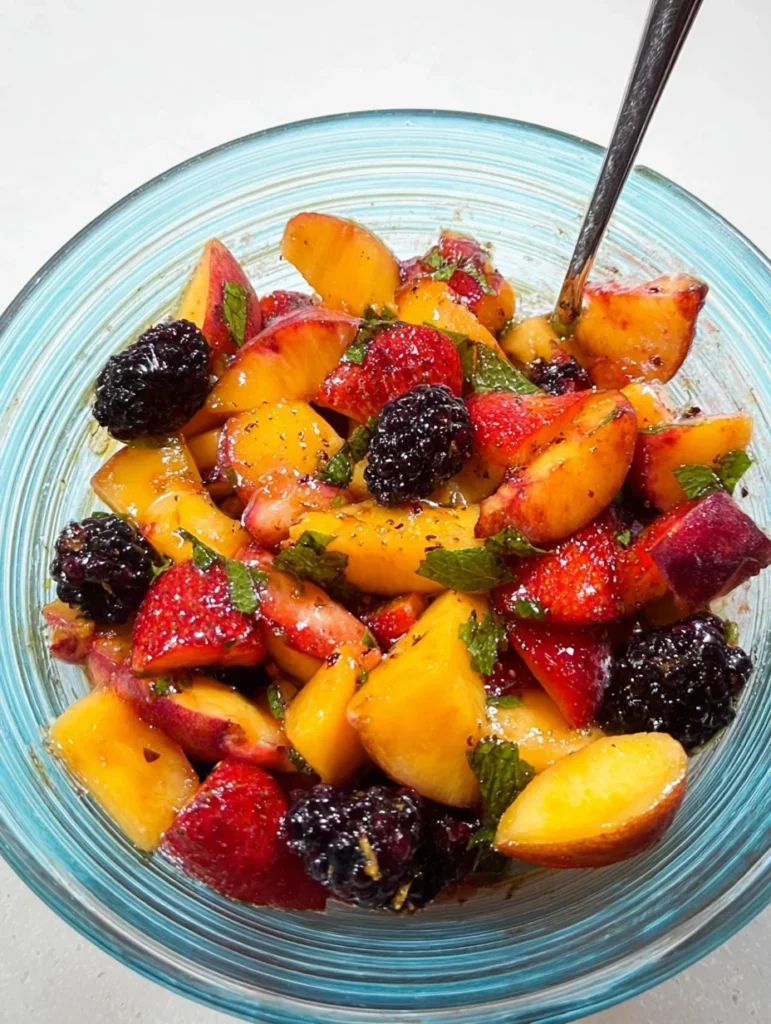 A refreshing summer salad featuring sweet peaches, strawberries, and blackberries, drizzled with a mint and honey dressing.