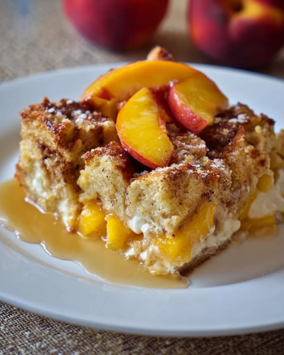 A delicious baked French toast with peaches and cream, perfect for a lovely morning meal!