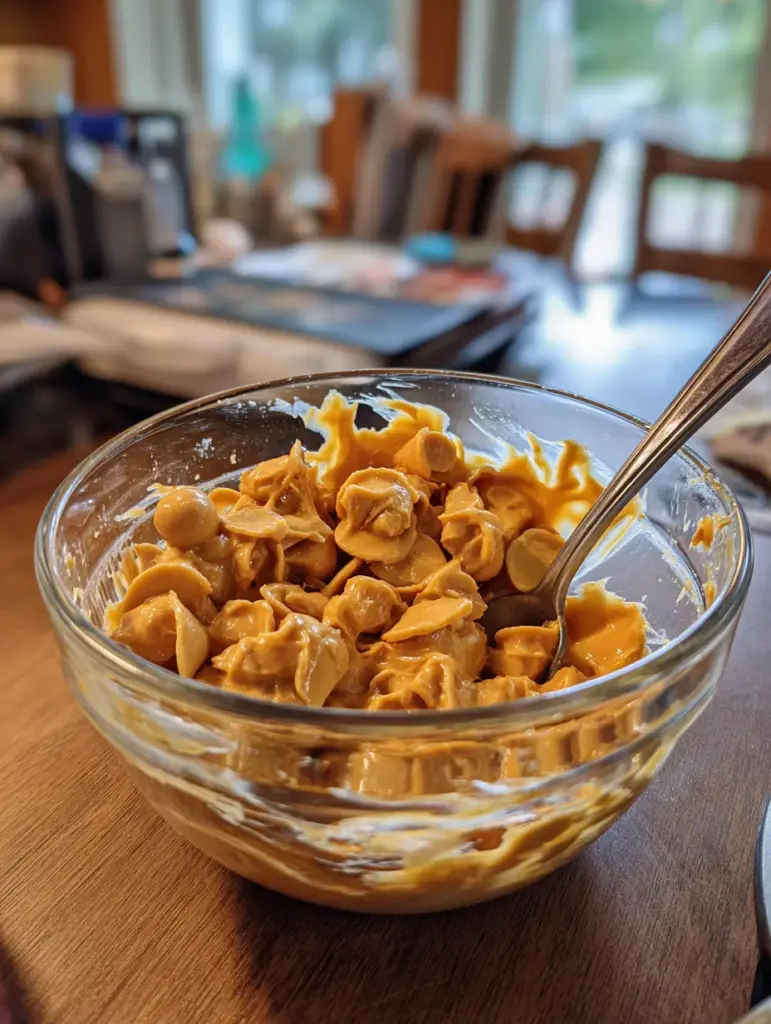Melt the peanut butter and butterscotch chips in a microwave-safe bowl in 20–25 second bursts, stirring each time until everything becomes smooth and glossy. Do not overheat. ⏱️ 2–3 minutes