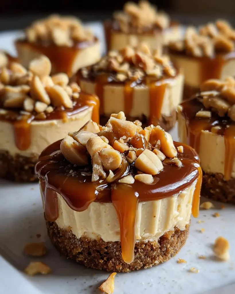 A delightful mini dessert that combines a graham cracker crust with a creamy peanut butter filling, topped with a rich caramel sauce and roasted peanuts.