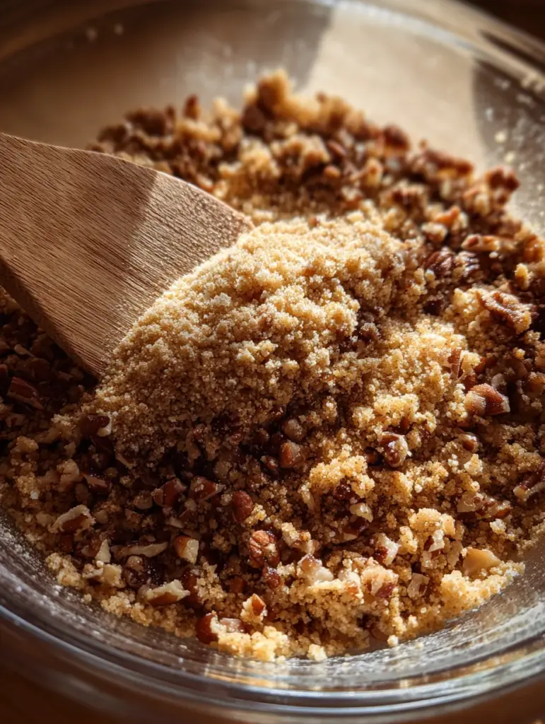 Combine the dry mix – In a large bowl, mix toasted pecans, graham cracker crumbs, brown sugar, and salt. (⏱️ 2 minutes)