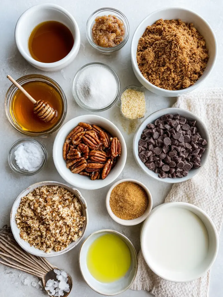 - Toasted pecans: provide texture and the essential pecan flavor; toasting brings out oils and aroma.