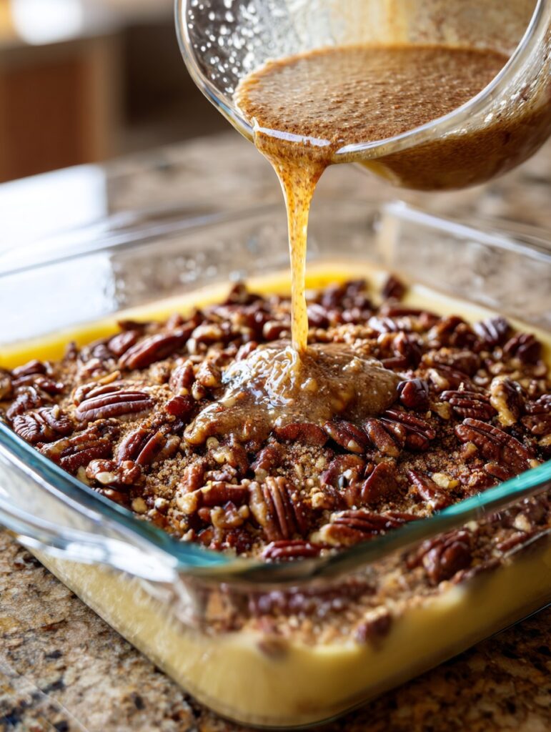 It might go against your baking instincts, but trust this method. Not stirring lets the ingredients settle naturally, creating that iconic three-layer texture—soft cake on top, sticky caramel in the middle, and buttery pecans on top.