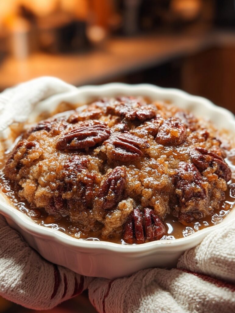 The water sinks, the batter rises, and you end up with three dreamy layers: a fluffy top, a gooey caramel middle, and a soft, buttery cake base. It’s pecan pie flavor meets cobbler comfort in the most satisfying way.