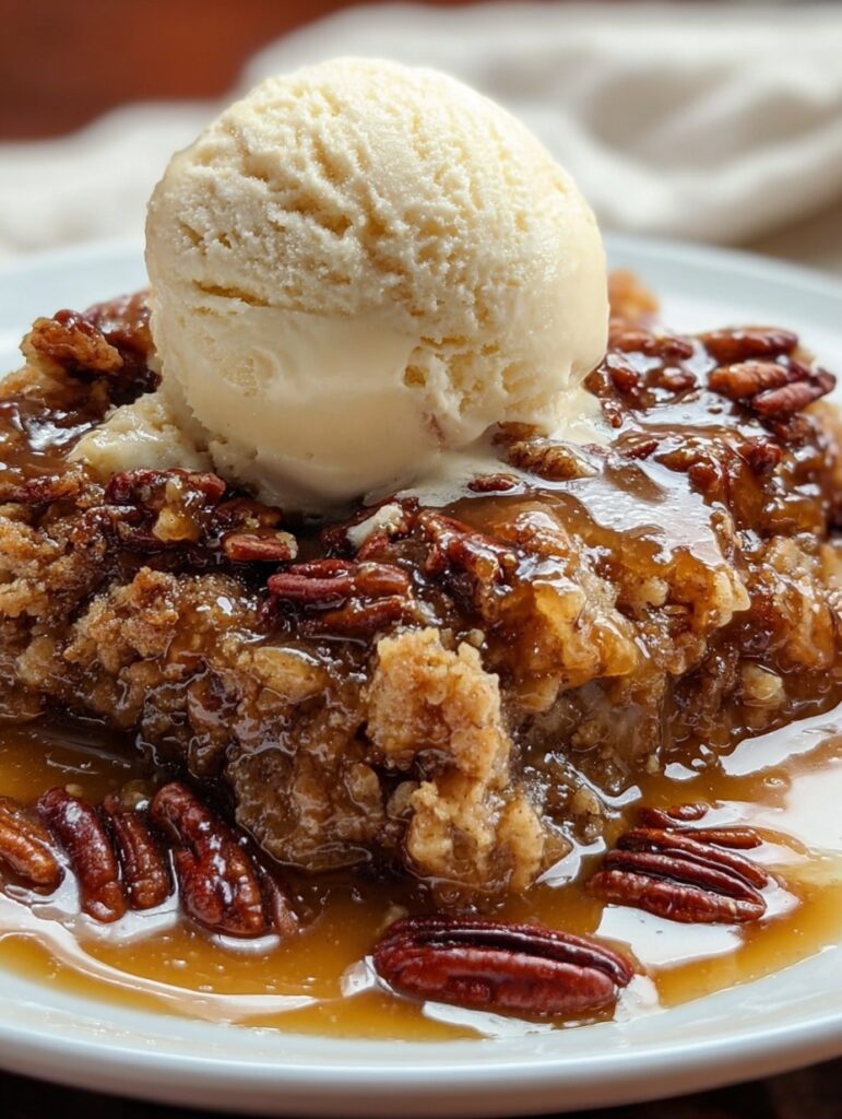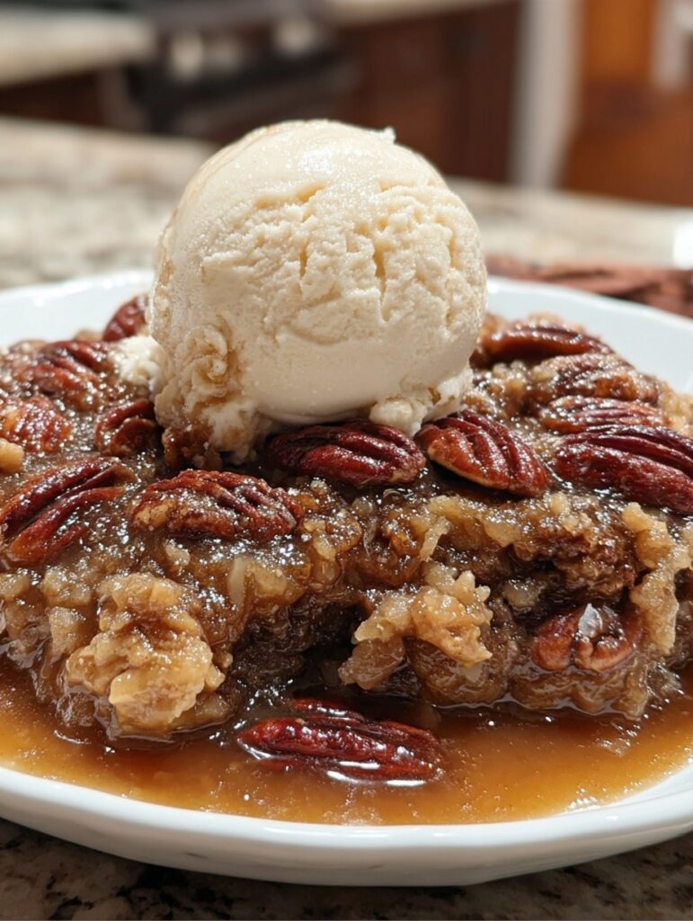 Picture this: golden-brown pecan topping, a soft, tender cake base, and a self-made caramel sauce that forms right in the pan. Add a scoop of vanilla ice cream on top, and you’ve got the kind of dessert that makes you close your eyes and smile after every bite. 🍨💛