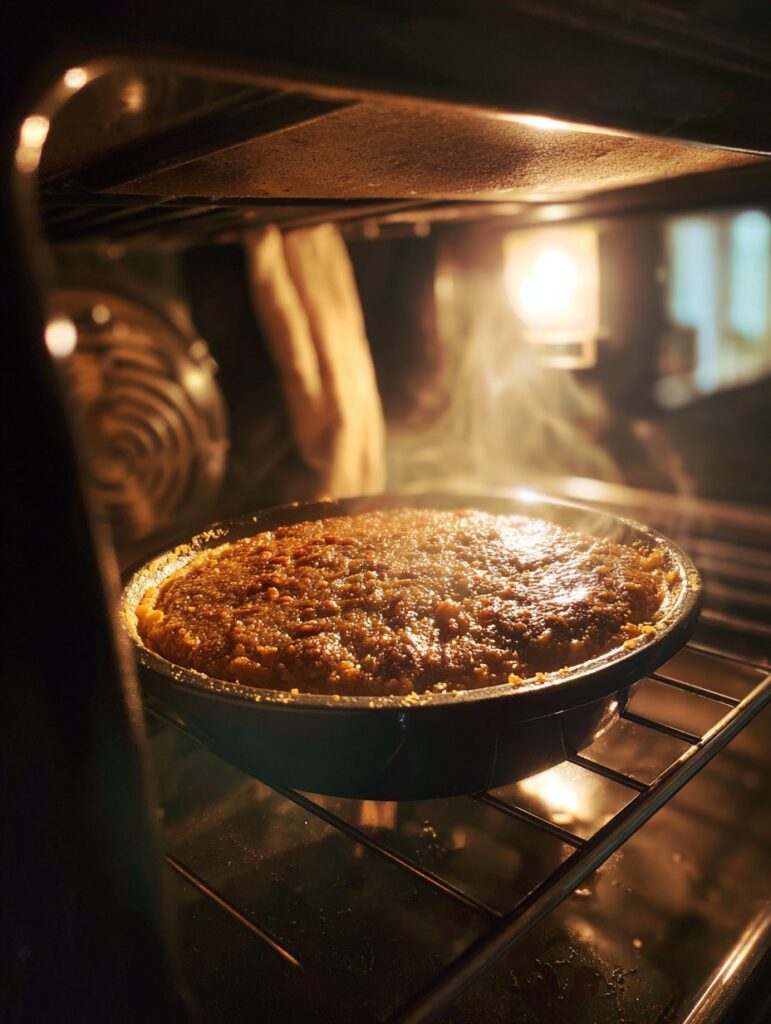 During baking, the layers naturally separate: a rich caramel base, a fluffy cake-like middle, and a nutty crisp topping. It’s like three desserts in one pan!