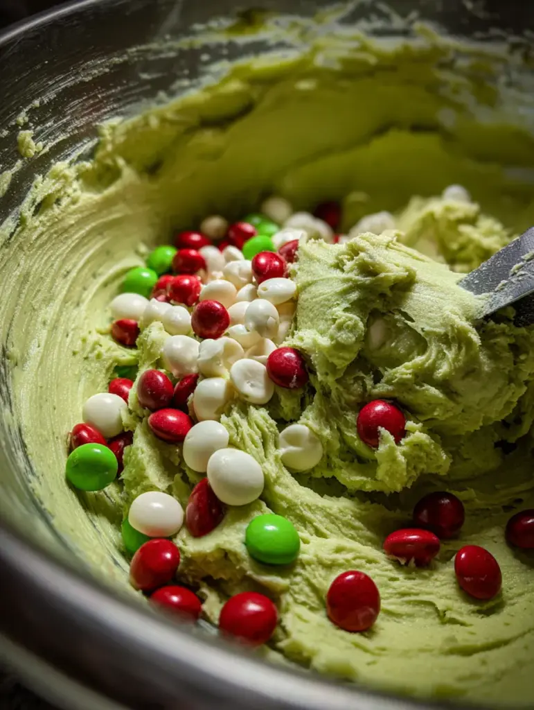 Fold in the white chocolate chips and ¾ cup of the red & green M&Ms, reserving the rest for topping. ⏱️ 2 minutes