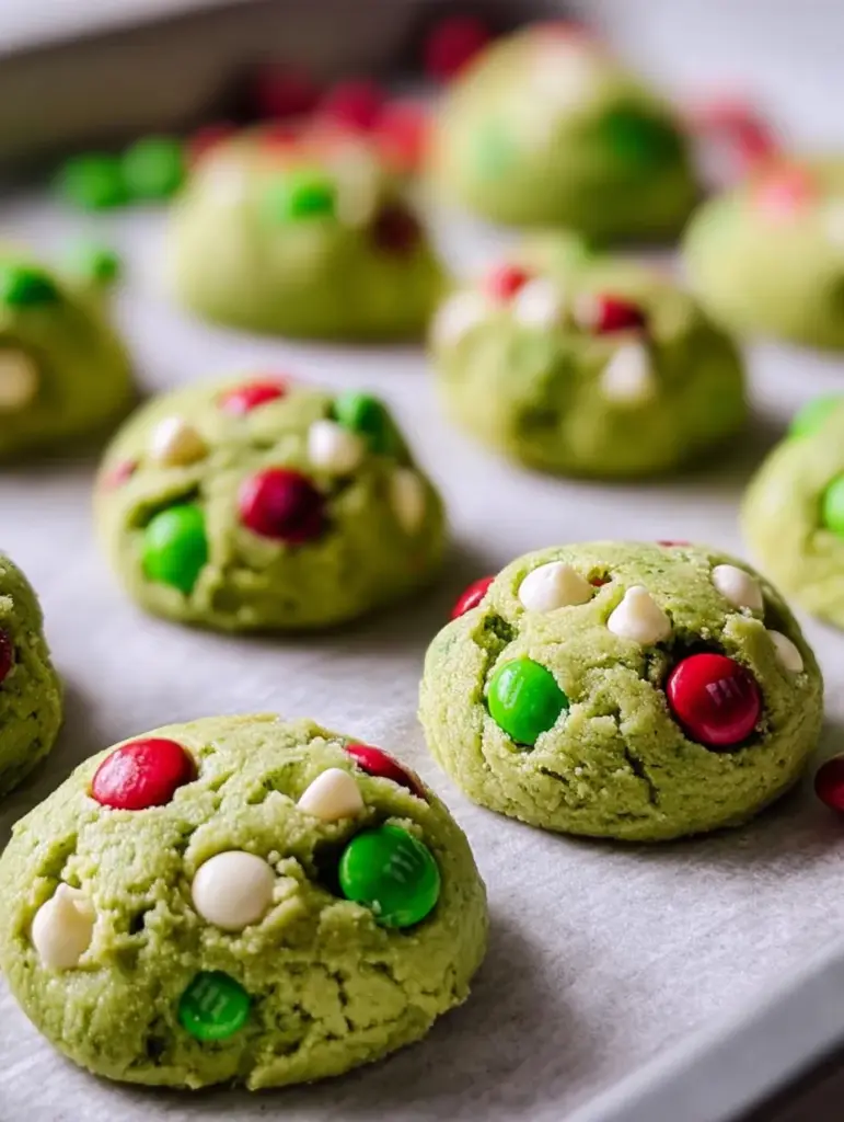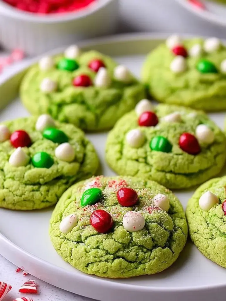 💚 Soft, puffy, brightly green, and filled with sweet pops of red and white! These festive Grinch cookies bake up thick, cozy, and magically crinkled — the ultimate holiday cookie joy. 🎄🍪✨
