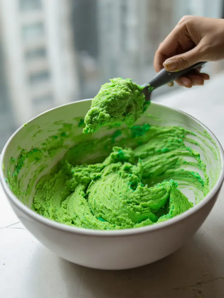 In a large mixing bowl, combine the white cake mix, melted butter, eggs, vanilla, and green gel food coloring. The dough should be thick, smooth, and vibrantly green. Use a spatula or hand mixer for ease. Make sure to scrape down the sides so everything’s evenly colored.