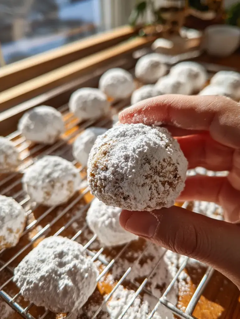 After they’ve fully cooled (another 20 minutes), roll them again in fresh powdered sugar (another ¾ cup). This gives them that classic, fluffy, snowy finish like in the photo.