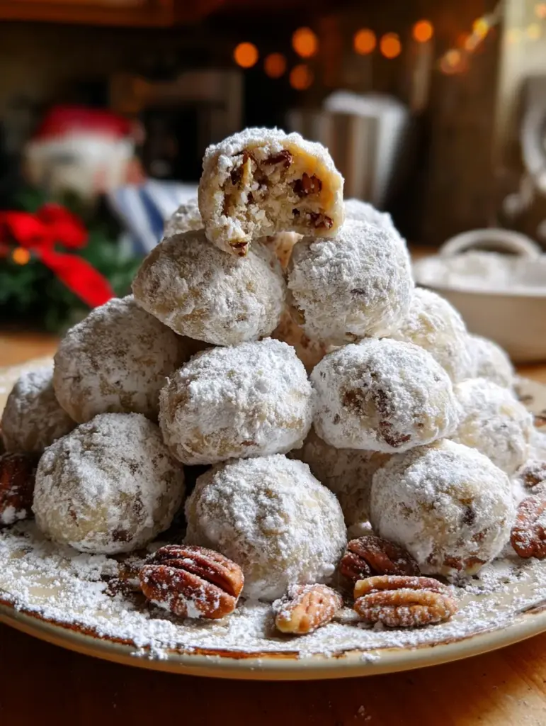 Let’s be honest—without the generous dusting of powdered sugar, these would just be buttery pecan balls (still delicious, but not nearly as festive). What makes these cookies look so magical, especially in the photo you saw, is the two-stage coating of powdered sugar. That snowy-white, velvety appearance isn’t just for show—it adds a delicate sweetness that balances the nutty richness of the pecans and the butter.