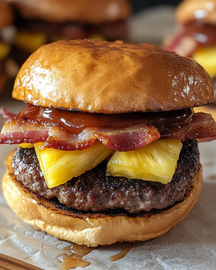A unique and delicious burger featuring juicy beef, smoky bacon, and sweet pineapple, perfect for grilling enthusiasts.