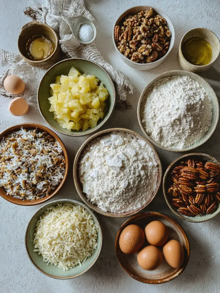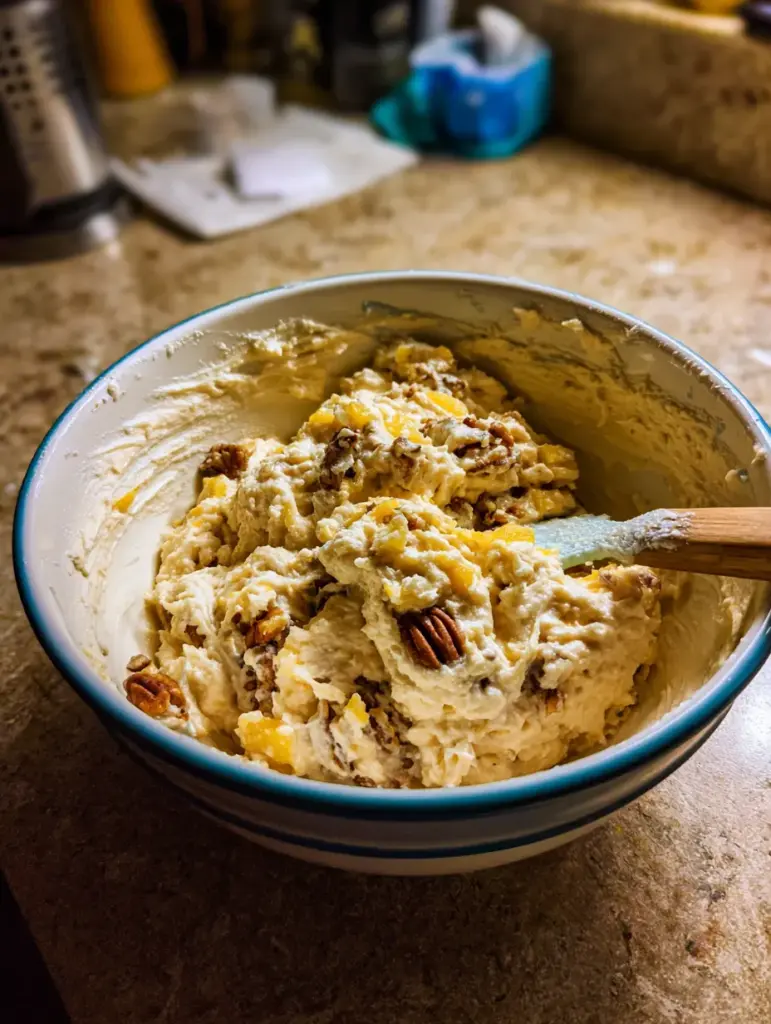- Fold in the coconut, drained pineapple, and chopped pecans. The mixture will look thick and textured—perfect!