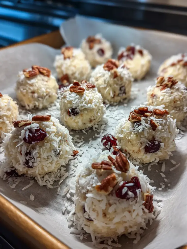 Well, these aren’t your average cheese balls. They’re basically little flavor bombs wrapped in a snowy winter coat. The rich cream cheese gives them a creamy, melt-in-your-mouth base. Then there’s the crushed pineapple—which adds a tropical zing. Dried cranberries bring a sweet-tart punch, while pecans add a buttery crunch. And don’t forget the shredded coconut, which not only looks stunning but also gives each bite a delightful chewiness.
