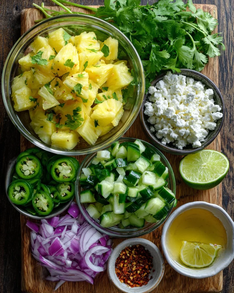 - Prepare the Ingredients: Dice the pineapple into bite-sized pieces, slice the cucumber into half-moons or small cubes, thinly slice the red onion and jalapeño (if using), chop the cilantro, and crumble the feta cheese (if using).