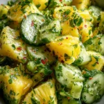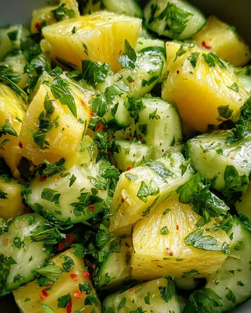 A refreshing and vibrant salad combining sweet pineapple and crisp cucumber, perfect for summer gatherings.