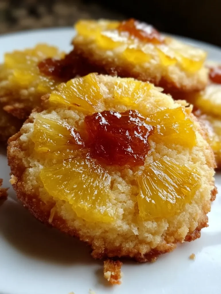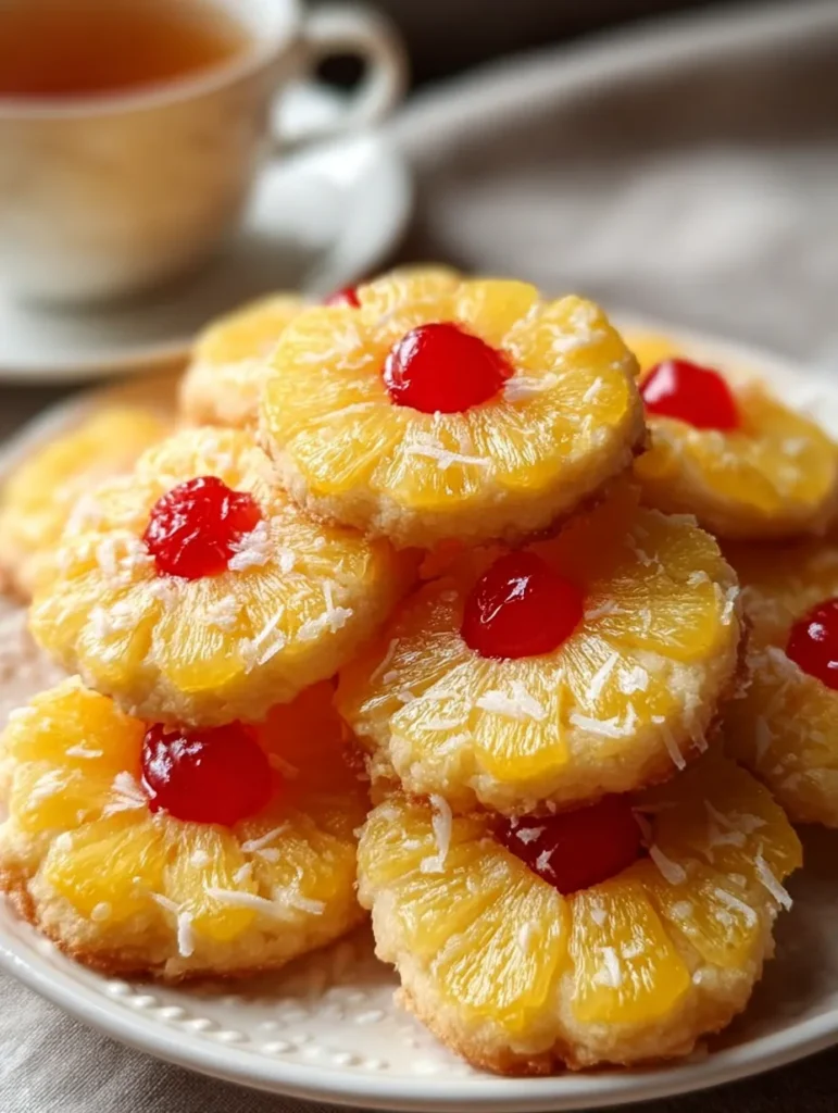 Every cookie features a golden sugar-butter base that caramelizes just enough to give you that deliciously chewy edge, topped with crushed pineapple for a juicy pop of flavor and—if you’re feeling fancy—a maraschino cherry right in the center for that classic retro look. ✨
