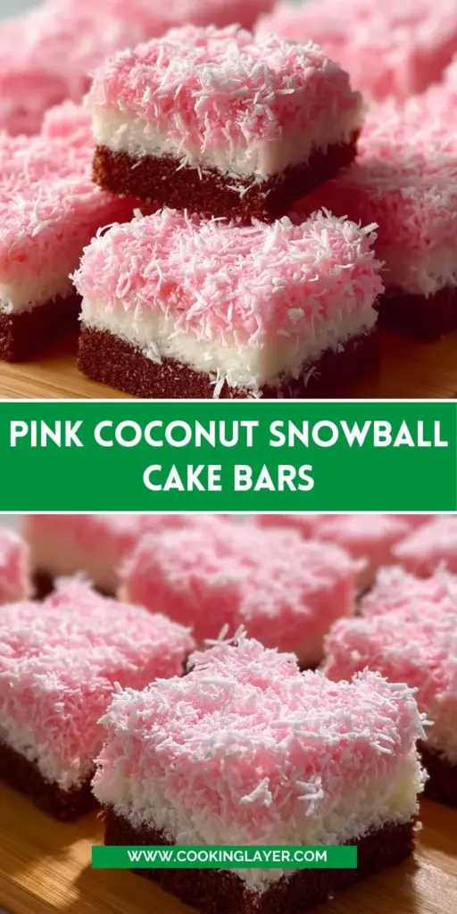 There’s something truly special about making Pink Coconut Snowball Cake Bars. Each time I whip up a batch, I’m reminded that baking is a delightful escape from the daily hustle. The vibrant colors and fluffy layers bring smiles and a touch of joy to my family’s faces. Whether it’s for a gathering or just a sweet treat after dinner, these bars don’t just satisfy cravings; they create moments worth savoring. So next time you’re feeling a bit creative in the kitchen, remember these bars—they’re more than a recipe; they’re an experience of love and happiness!