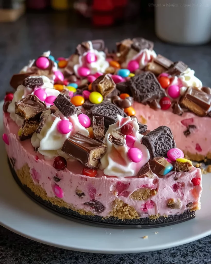 This Pink M&M Snickers Cheesecake is a delightful and colorful dessert that combines the rich flavors of cream cheese, chocolate, and Snickers bars with a fun pink twist, perfect for any occasion.