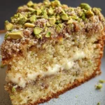Indulge in a moist and flavorful pistachio coffee cake topped with a crunchy streusel, perfect for any occasion.