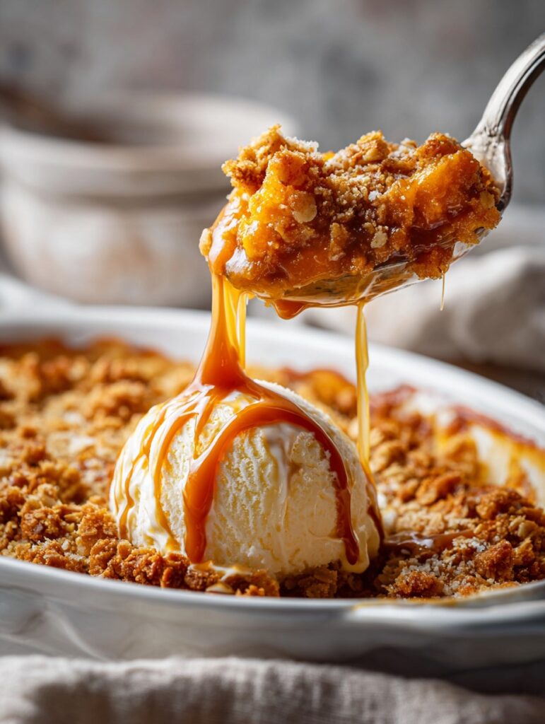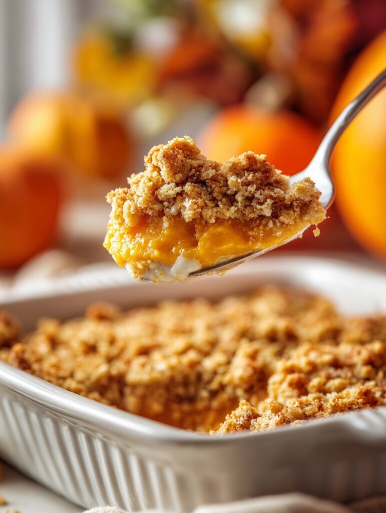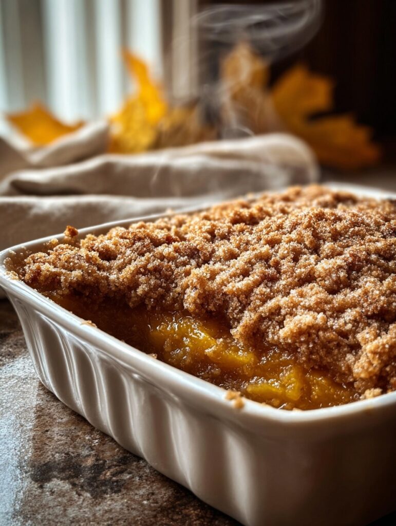 This dessert combines everything you love about pumpkin pie—the smooth, spiced filling—with a buttery, crumbly topping that adds the perfect crunch. Imagine the sweet scent of cinnamon and nutmeg wafting through your home as the golden topping bakes to perfection. It’s cozy, it’s comforting, and it tastes just like autumn.