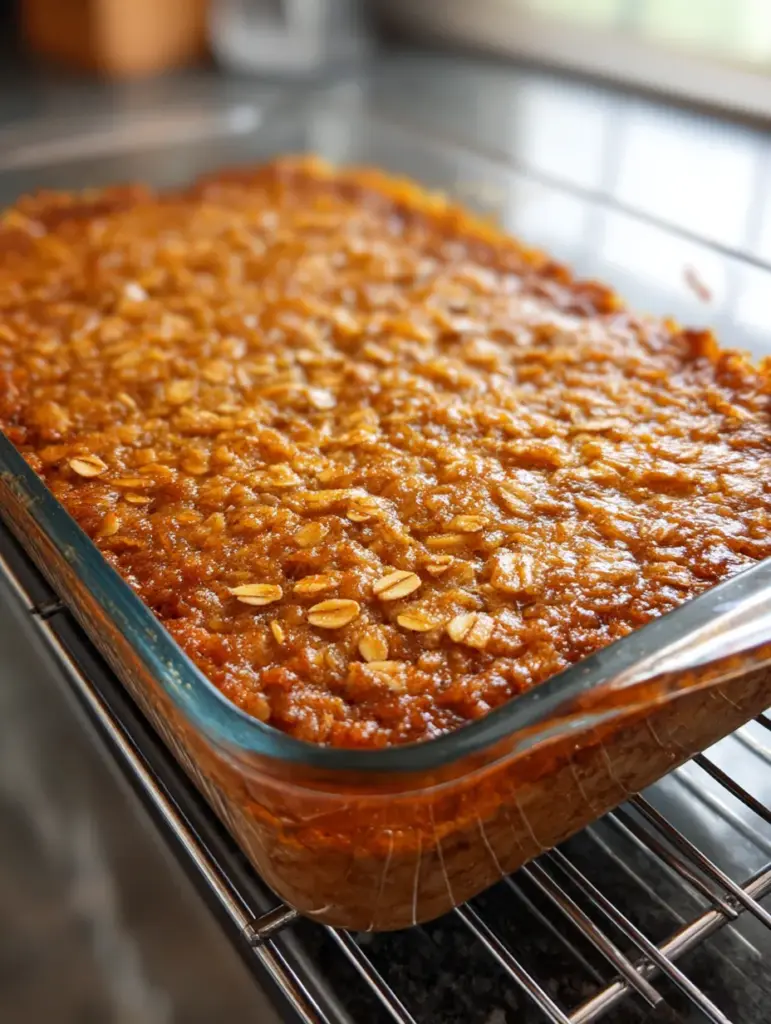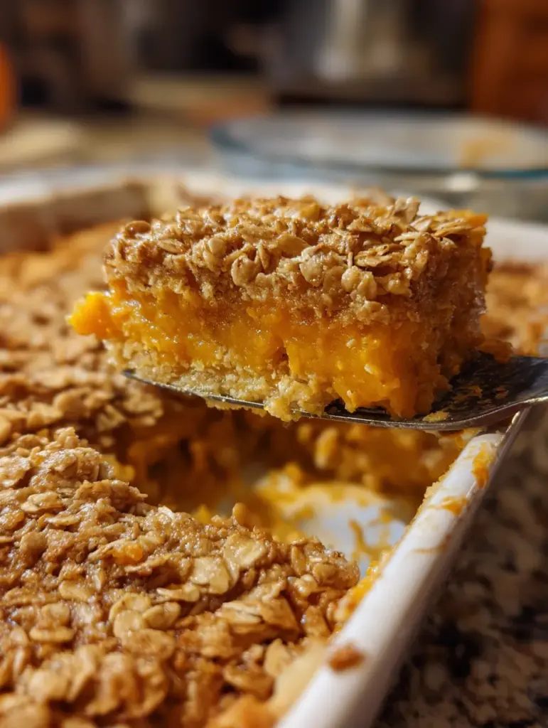If you’re wondering what the end result looks like, picture this: a thick, golden-brown square of pumpkin-spiced cake, with hearty oats baked right in. It’s moist and rich on the bottom with a crunchy, buttery topping that makes every bite interesting.